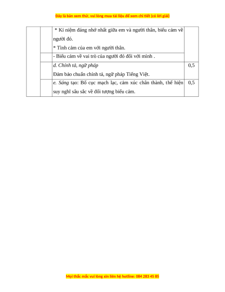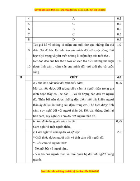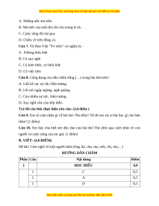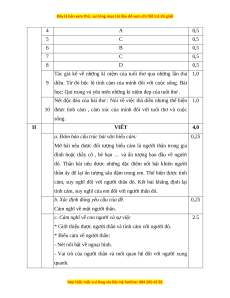 Đề bài: Cảm nghĩ về một người thân (ông, bà, cha, mẹ, anh, chị, em,…) HƯỚNG DẪN CHẤM Phần Câu Nội dung Điểm I ĐỌC HIỂU 4,0 1 C 0,5 2 A 0,5 3 D 0,5