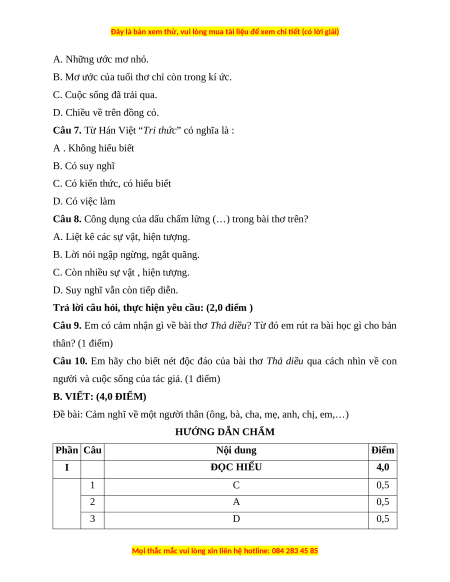 Câu 9. Em có cảm nhận gì về bài thơ Thả diều? Từ đó em rút ra bài học gì cho bản thân? (1 điểm)