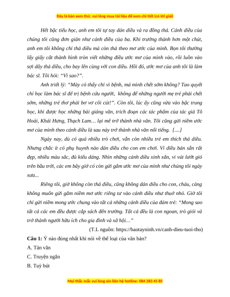 Câu 1: Ý nào đúng nhất khi nói về thể loại của văn bản? A. Tản văn C. Truyện ngắn B. Tuỳ bút