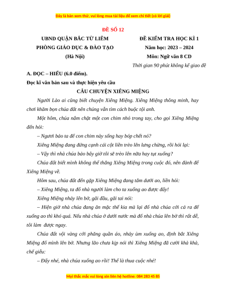 Năm học: 2023 – 2024 (Hà Nội) Môn: Ngữ văn 8 CD