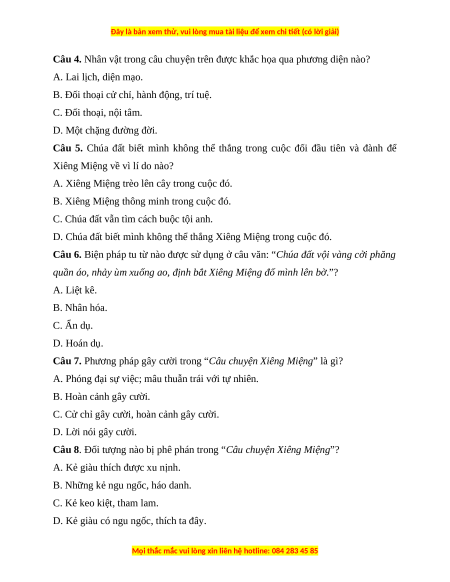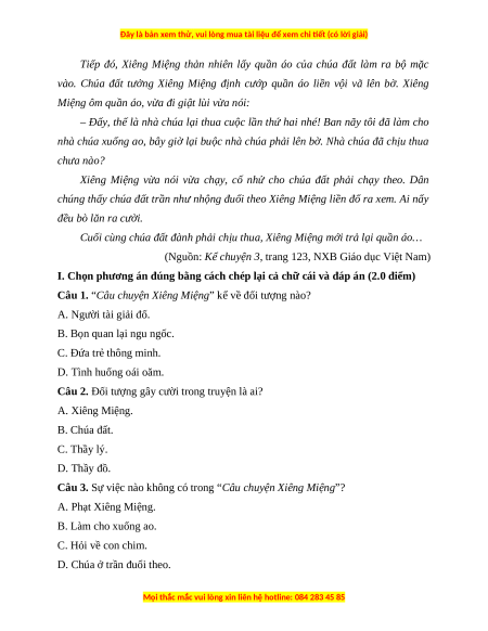 Câu 2. Đối tượng gây cười trong truyện là ai? A. Xiêng Miệng. B. Chúa đất. C. Thầy lý. D. Thầy đồ.