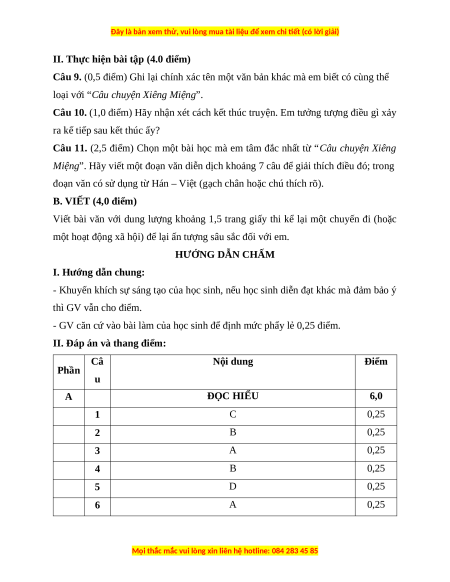 II. Đáp án và thang điểm: Câ Nội dung Điểm Phần u A ĐỌC HIỂU 6,0 1 C 0,25 2 B 0,25 3 A 0,25 4 B 0,25 5 D 0,25 6 A 0,25
