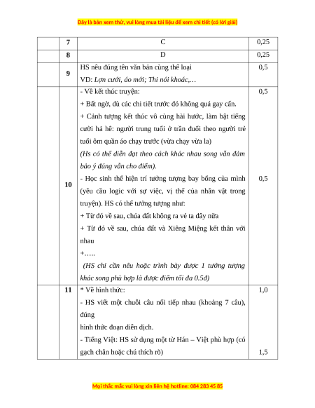 - GV căn cứ vào bài làm của học sinh để định mức phẩy lẻ 0,25 điểm.