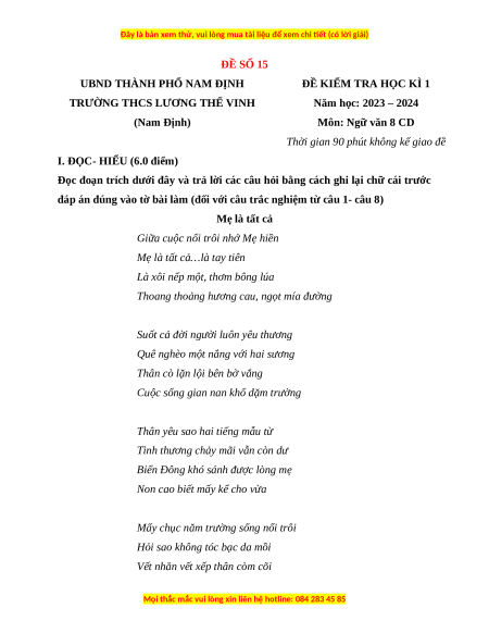 Năm học: 2023 – 2024 (Nam Định) Môn: Ngữ văn 8 CD