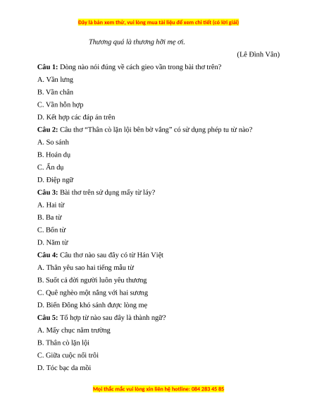 Câu 1: Dòng nào nói đúng về cách gieo vần trong bài thơ trên? A. Vần lưng B. Vần chân C. Vần hỗn hợp