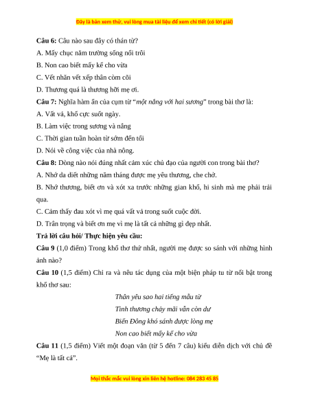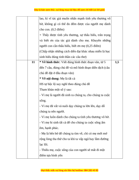 Câu 11 (1,5 điểm) Viết một đoạn văn (từ 5 đến 7 câu) kiểu diễn dịch với chủ đề “Mẹ là tất cả”.