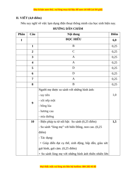 Nêu suy nghĩ về việc lạm dụng điện thoại thông minh của học sinh hiện nay. HƯỚNG DẪN CHẤM Phần Câu Nội dung Điểm I ĐỌC HIỂU 6,0 1 B 0,25 2 C 0,25 3 A 0,25 4 A 0,25 5 D 0,25 6 D 0,25 7 A 0,25 8 B 0,25