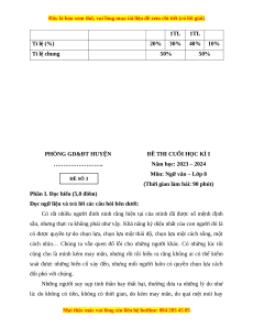 Mức độ nhận thức Tổng Kĩ Nhận Thông Vận Vận TT Nội dung % năng biết hiểu dụng dụng cao điểm TN TL TN TL TN TL TN TL Đọc Văn bản 1 2 0 2 1 2 1 0 0 50 hiểu nghị luận Viết bài văn nghị luận về 2 Viết 0 1* 0 1* 0 1* 0 1* 50 một vấn đề của đời sống Tổng 10 10 10 20 10 30 0 10 Tỉ lệ % 20% 30% 40% 10% 100% Tỉ lệ chung 50% 50%