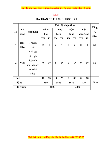 Mức độ nhận thức Tổng Kĩ Nhận Thông Vận Vận TT Nội dung % năng biết hiểu dụng dụng cao điểm TN TL TN TL TN TL TN TL Đọc Truyện 1 2 0 2 1 0 2 0 0 50 hiểu cười Viết bài văn nghị luận về 2 Viết 0 1* 0 1* 0 1* 0 1* 50 một vấn đề của đời sống Tổng 10 15 10 25 0 30 0 10 Tỉ lệ % 25% 35% 30% 10% 100% Tỉ lệ chung 60% 40%