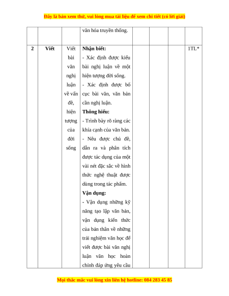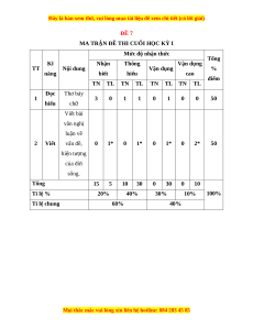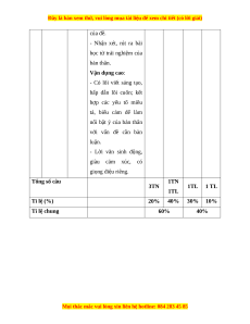 nổi bật ý của bản thân với vấn đề cần bàn luận. - Lời văn sinh động, giàu cảm xúc, có giọng điệu riêng. Tổng số câu 1TN 3TN 1TL 1 TL 1TL Tỉ lệ (%) 20% 40% 30% 10% Tỉ lệ chung 60% 40%
