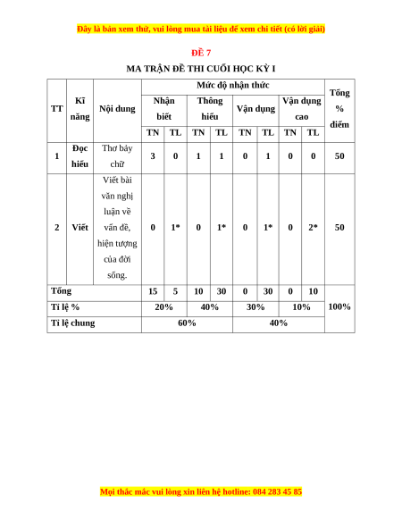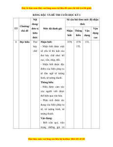 Mức độ nhận thức Tổng Kĩ Nhận Thông Vận dụng TT Nội dung Vận dụng % năng biết hiểu cao điểm TN TL TN TL TN TL TN TL Đọc Thơ bảy 1 3 0 1 1 0 1 0 0 50 hiểu chữ Viết bài văn nghị luận về 2 Viết vấn đề, 0 1* 0 1* 0 1* 0 2* 50 hiện tượng của đời sống. Tổng 15 5 10 30 0 30 0 10 Tỉ lệ % 20% 40% 30% 10% 100% Tỉ lệ chung 60% 40%