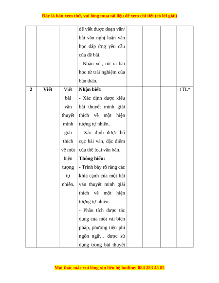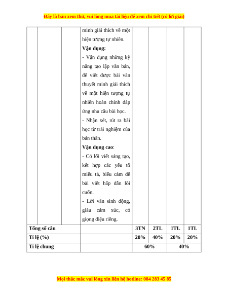 Mức độ nhận thức Tổng Kĩ Nhận Thông Vận Vận TT Nội dung % năng biết hiểu dụng dụng cao điểm TN TL TN TL TN TL TN TL Đọc Văn bản 1 3 0 0 2 0 1 0 0 50 hiểu nghị luận Viết bài văn thuyết mình giải 2 Viết thích về 0 1* 0 1* 0 1* 0 2* 50 một hiện tượng tự nhiên. Tổng 15 5 0 40 0 20 0 20 100% Tỉ lệ % 20% 40% 20% 20% Tỉ lệ chung 60% 40%