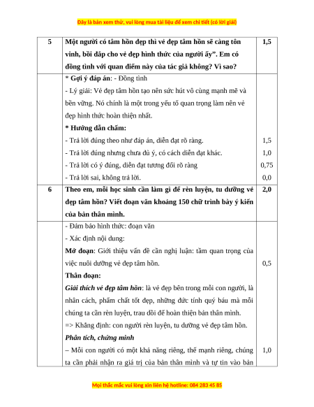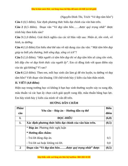 Đoạn văn “Vẻ đẹp tâm hồn…….được quý trọng nhất” được (0,5)