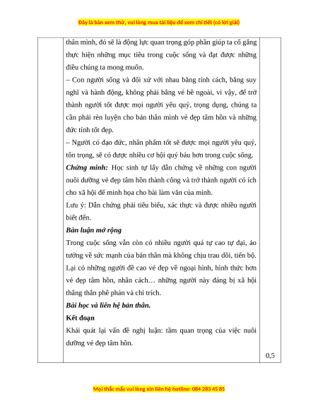 việc nuôi dưỡng vẻ đẹp tâm hồn. 0,5 Thân đoạn: