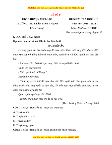 Năm học: 2023 – 2024 (Tiền Giang) Môn: Ngữ văn 8 CTST