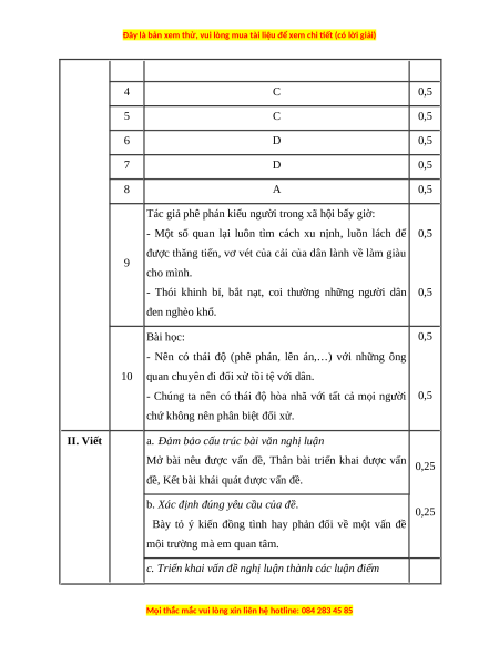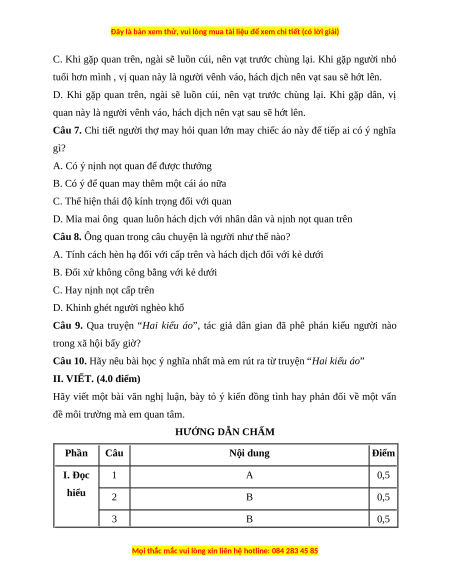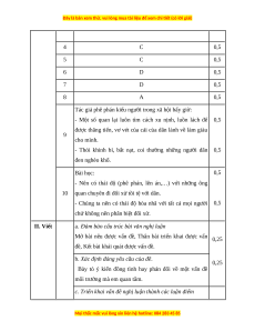 đề môi trường mà em quan tâm. HƯỚNG DẪN CHẤM Phần Câu Nội dung Điểm I. Đọc 1 A 0,5 hiểu 2 B 0,5 3 B 0,5