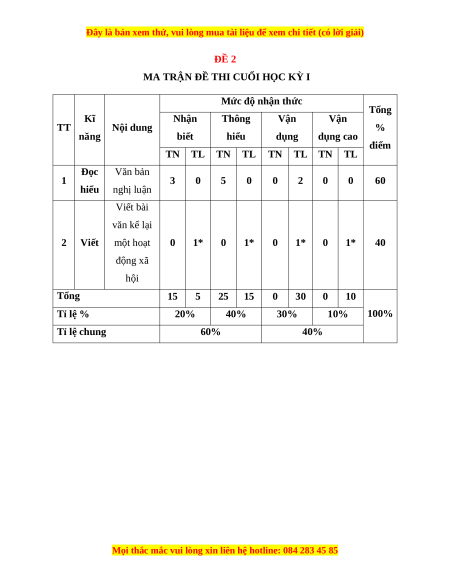 Mức độ nhận thức Tổng Kĩ Nhận Thông Vận Vận TT Nội dung % năng biết hiểu dụng dụng cao điểm TN TL TN TL TN TL TN TL Đọc Văn bản 1 3 0 5 0 0 2 0 0 60 hiểu nghị luận Viết bài văn kể lại 2 Viết một hoạt 0 1* 0 1* 0 1* 0 1* 40 động xã hội Tổng 15 5 25 15 0 30 0 10 Tỉ lệ % 20% 40% 30% 10% 100% Tỉ lệ chung 60% 40%