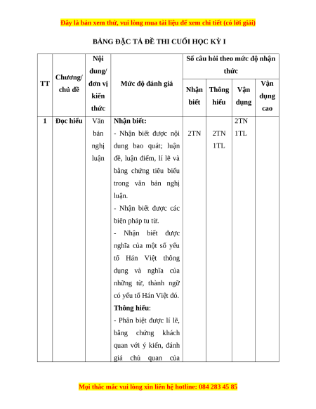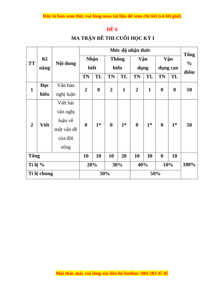 Mức độ nhận thức Tổng Kĩ Nhận Thông Vận Vận TT Nội dung % năng biết hiểu dụng dụng cao điểm TN TL TN TL TN TL TN TL Đọc Văn bản 1 2 0 2 1 2 1 0 0 50 hiểu nghị luận Viết bài văn nghị luận về 2 Viết 0 1* 0 1* 0 1* 0 1* 50 một vấn đề của đời sống Tổng 10 10 10 20 10 30 0 10 Tỉ lệ % 20% 30% 40% 10% 100% Tỉ lệ chung 50% 50%
