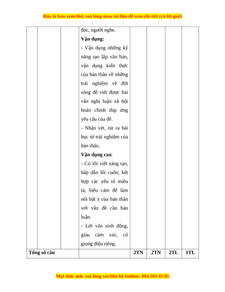 nổi bật ý của bản thân với vấn đề cần bàn luận. - Lời văn sinh động, giàu cảm xúc, có giọng điệu riêng. Tổng số câu 2TN 2TN 2TL 1TL