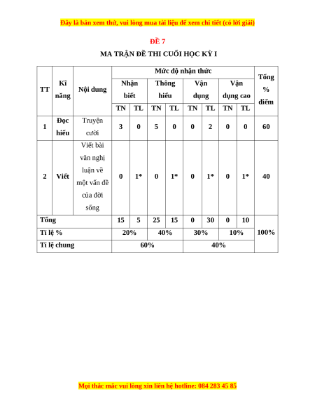 Mức độ nhận thức Tổng Kĩ Nhận Thông Vận Vận TT Nội dung % năng biết hiểu dụng dụng cao điểm TN TL TN TL TN TL TN TL Đọc Truyện 1 3 0 5 0 0 2 0 0 60 hiểu cười Viết bài văn nghị luận về 2 Viết 0 1* 0 1* 0 1* 0 1* 40 một vấn đề của đời sống Tổng 15 5 25 15 0 30 0 10 Tỉ lệ % 20% 40% 30% 10% 100% Tỉ lệ chung 60% 40%