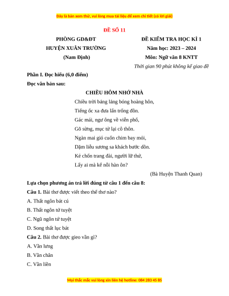 Năm học: 2023 – 2024 (Nam Định) Môn: Ngữ văn 8 KNTT