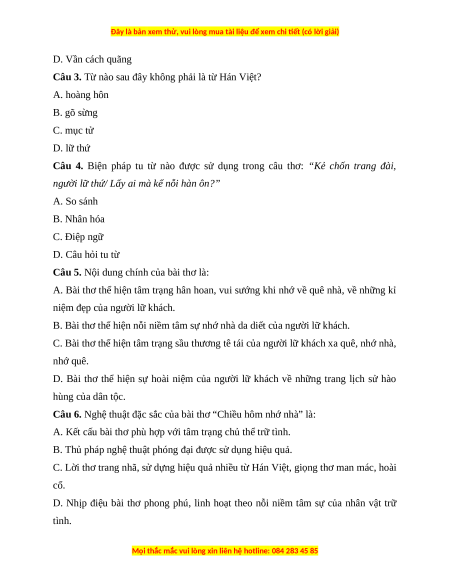 Câu 3. Từ nào sau đây không phải là từ Hán Việt? A. hoàng hôn B. gõ sừng C. mục tử D. lữ thứ