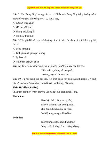 Câu 7. Từ “bảng lảng” trong câu thơ: “Chiều trời bảng lảng bóng hoàng hôn/