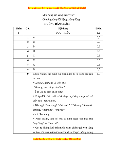 Cò trắng từng đôi liệng xuống đồng. HƯỚNG DẪN CHẤM Phần Câu Nội dung Điểm I ĐỌC - HIỂU 6,0 1 A 0,5 2 B 0,5 3 B 0,5 4 D 0,5 5 C 0,5 6 C 0,5 7 A 0,5 8 B 0,5 9