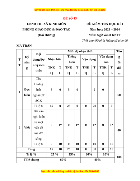 Năm học: 2023 – 2024 (Hải Dương) Môn: Ngữ văn 8 KNTT