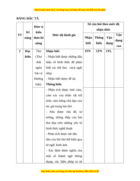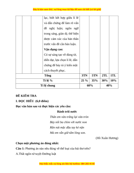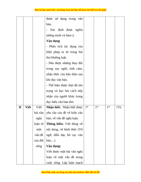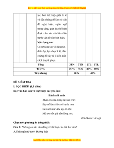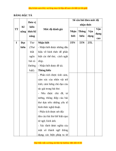 Mức độ nhận thức Tổn Nội Kỹ Thông Vận dụng g T dung/Đơ Nhận biết Vận dụng năn hiểu cao % T n vị kiến g TNK T TNK T TNK T TNK T điể thức Q L Q L Q L Q L m Thơ Đường Đọc luật 3 0 5 0 2 0 1 hiểu ngoài CT 60 SGK Tỉ lệ % 15 0 25 0 0 20 0 0 Bài văn nghị luận về một 0 1* 0 1* 0 1* 0 1* 2 Viết vấn đề 40 của đời sống Tỉ lệ % 0 10 0 10 0 10 0 10 Tổng 15 10 25 10 0 30 0 10 Tỉ lệ % 25 % 35% 30% 10% 100 Tỉ lệ chung 60% 40%