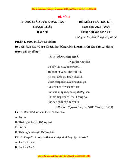 Năm học: 2023 – 2024 (Hà Nội) Môn: Ngữ văn 8 KNTT