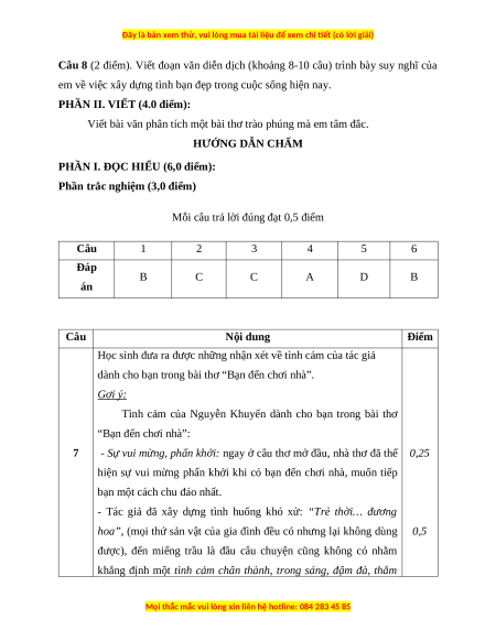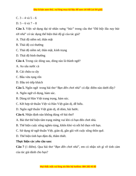 Câu 7 (1 điểm). Qua bài thơ “Bạn đến chơi nhà”, em có nhận xét gì về tình cảm