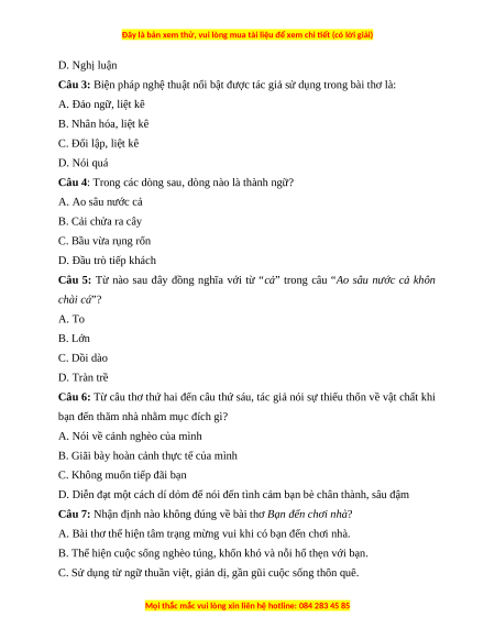 Câu 2: Bài thơ “Bạn đến chơi nhà” viết theo phương thức biểu đạt chính nào? A. Tự sự B. Biểu cảm C. Miêu tả