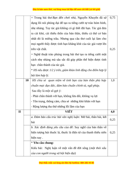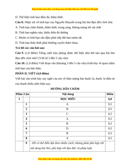 của thanh thiếu niên hiện nay. HƯỚNG DẪN CHẤM Phần Câu Nội dung Điểm I ĐỌC HIỂU 6,0 1 A 0,5 2 B 0,5 3 C 0,5 4 A 0,5 5 B 0,5 6 D 0,5 7 B 0,5 8 A 0,5