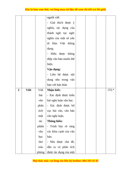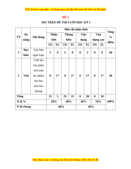 Mức độ nhận thức Tổng Kĩ Nhận Thông Vận Vận TT Nội dung % năng biết hiểu dụng dụng cao điểm TN TL TN TL TN TL TN TL Đọc Văn bản 1 3 0 5 0 0 2 0 0 60 hiểu nghị luận Viết bài văn phân tích một 2 Viết tác phẩm 0 1* 0 1* 0 1* 0 1* 40 văn học thơ trào phúng Tổng 15 5 25 15 0 30 0 10 Tỉ lệ % 20% 40% 30% 10% 100% Tỉ lệ chung 60% 40%