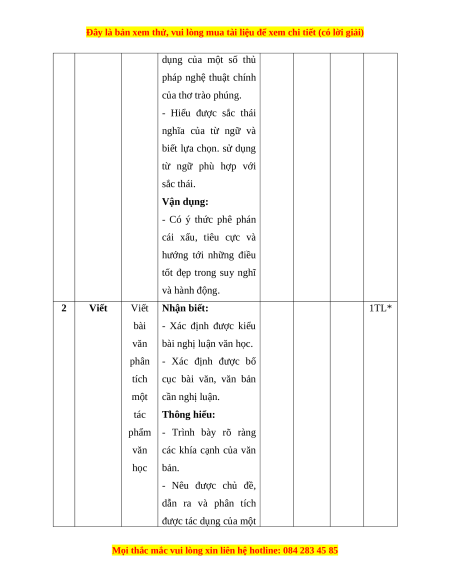 Mức độ nhận thức Tổng Kĩ Nhận Thông Vận Vận TT Nội dung % năng biết hiểu dụng dụng cao điểm TN TL TN TL TN TL TN TL Đọc Thơ trào 1 3 0 5 0 0 2 0 0 60 hiểu phúng Viết bài văn phân 2 Viết tích một 0 1* 0 1* 0 1* 0 1* 40 tác phẩm văn học Tổng 15 5 25 15 0 30 0 10 Tỉ lệ % 20% 40% 30% 10% 100% Tỉ lệ chung 60% 40%