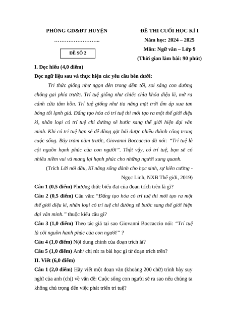 Môn: Ngữ văn – Lớp 9 ĐỀ SỐ 2
