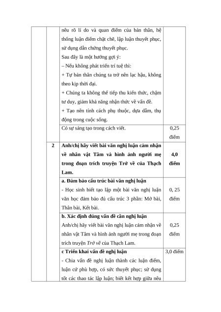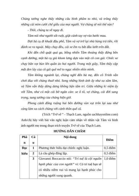 ảnh người mẹ trong đoạn trích truyện Trở về của Thạch Lam. HƯỚNG DẪN CHẤM Phầ Câ Nội dung Điểm n u Đọc 1