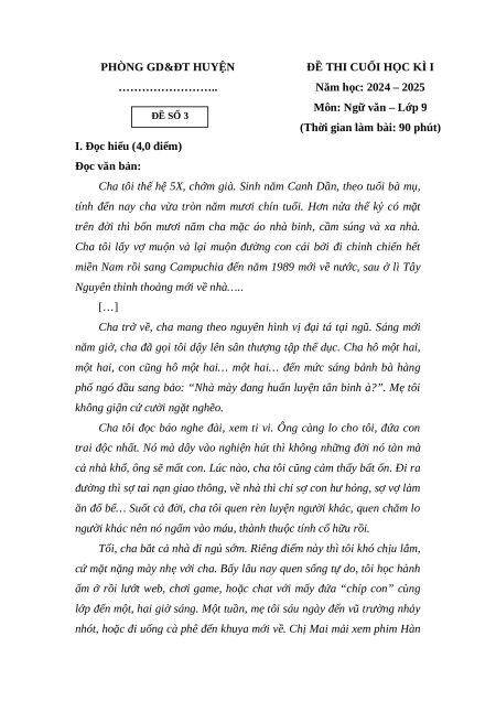 Môn: Ngữ văn – Lớp 9 ĐỀ SỐ 3