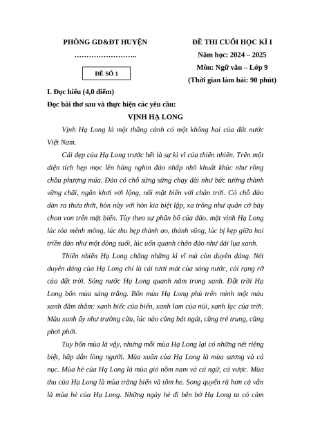 Môn: Ngữ văn – Lớp 9 ĐỀ SỐ 1
