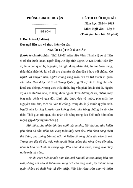 Môn: Ngữ văn – Lớp 9 ĐỀ SỐ 4