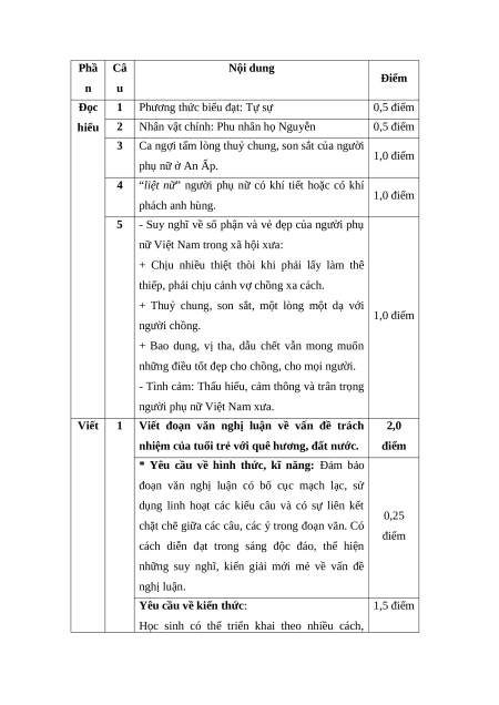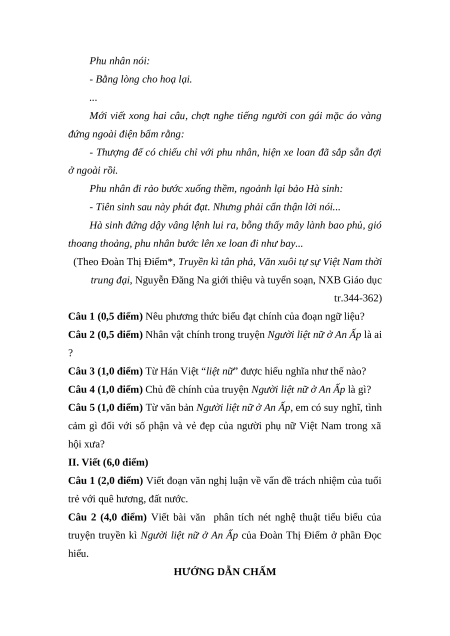 truyện truyền kì Người liệt nữ ở An Ấp của Đoàn Thị Điểm ở phần Đọc hiểu. HƯỚNG DẪN CHẤM Phầ Câ Nội dung Điểm n u Đọc 1