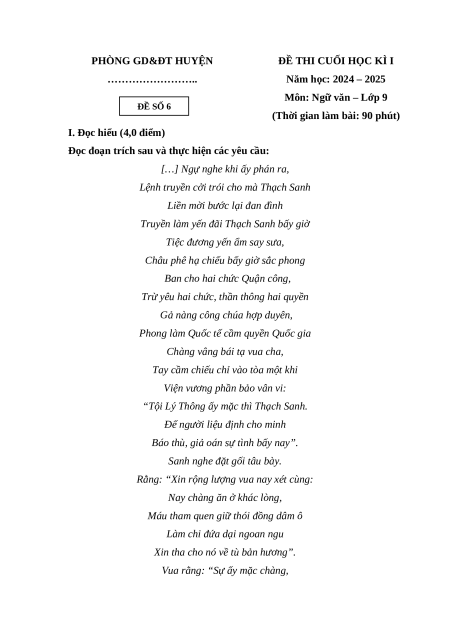 Môn: Ngữ văn – Lớp 9 ĐỀ SỐ 6