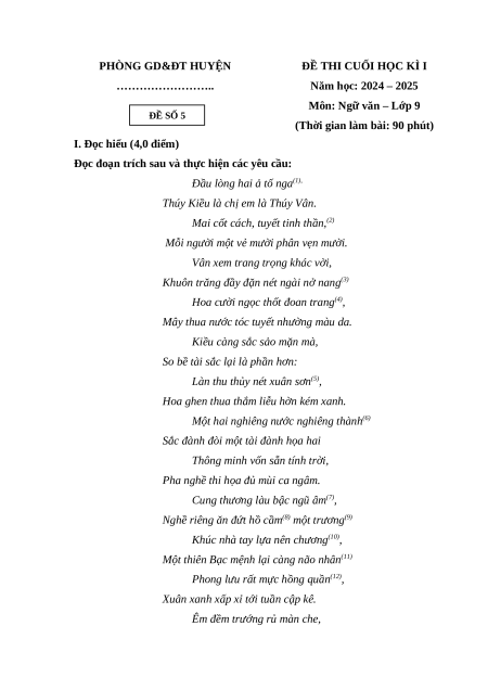 Môn: Ngữ văn – Lớp 9 ĐỀ SỐ 5