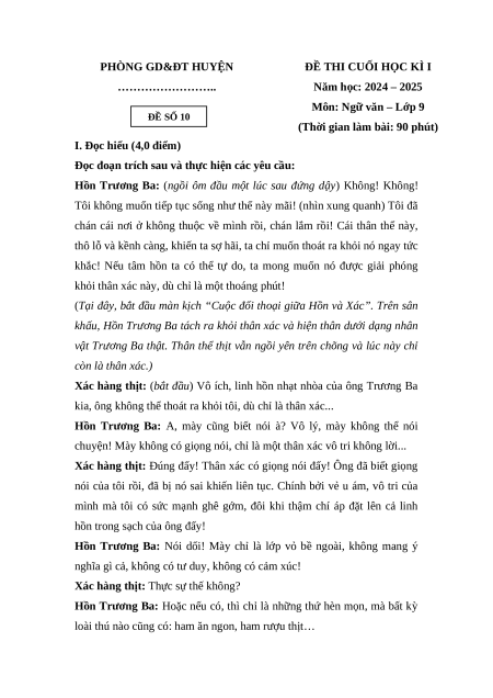 Môn: Ngữ văn – Lớp 9 ĐỀ SỐ 10