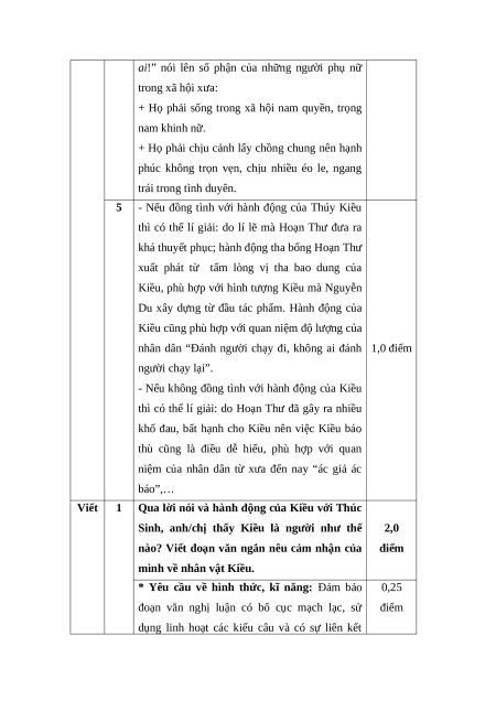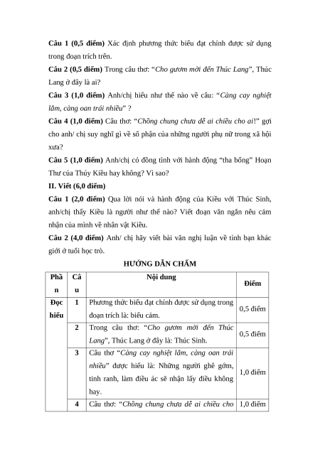 Câu 1 (2,0 điểm) Qua lời nói và hành động của Kiều với Thúc Sinh,