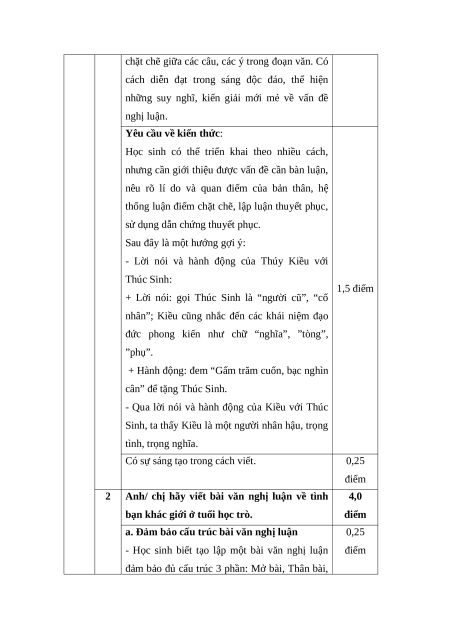 Câu 2 (4,0 điểm) Anh/ chị hãy viết bài văn nghị luận về tình bạn khác giới ở tuổi học trò. HƯỚNG DẪN CHẤM Phầ Câ Nội dung Điểm n u Đọc 1