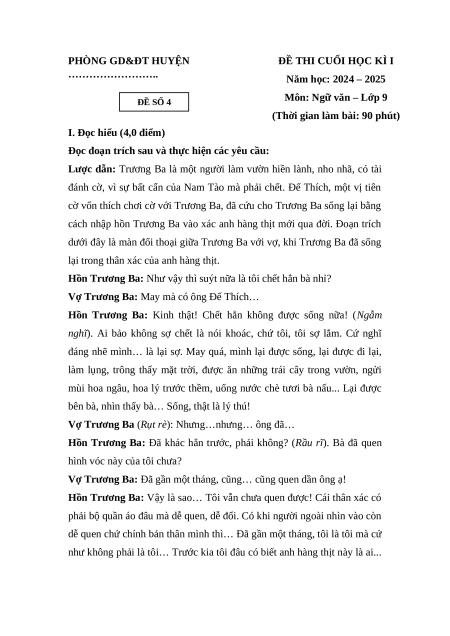Môn: Ngữ văn – Lớp 9 ĐỀ SỐ 4