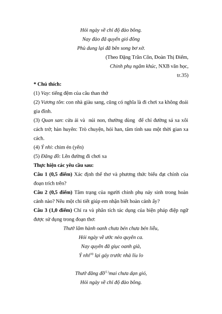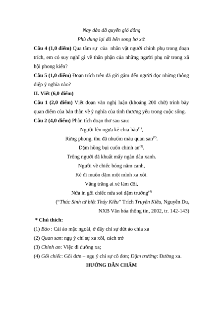 Câu 4 (1,0 điểm) Qua tâm sự của nhân vật người chinh phụ trong đoạn