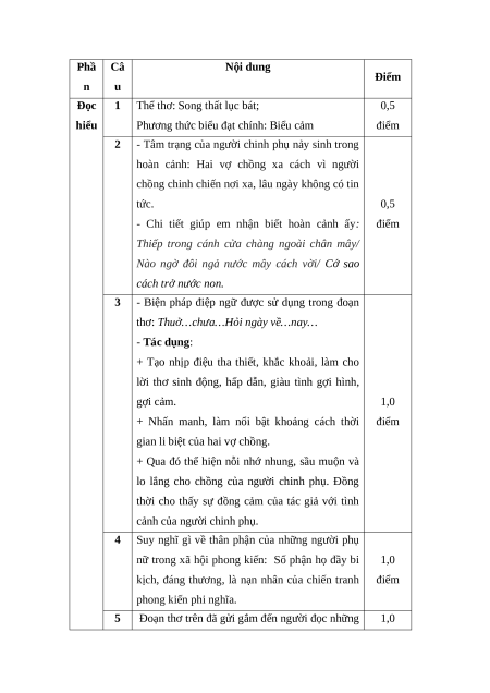 (4) Gối chiếc: Gối đơn – ngụ ý chỉ sự cô đơn; Dặm trường: Đường xa. HƯỚNG DẪN CHẤM Phầ Câ Nội dung Điểm n u Đọc 1
